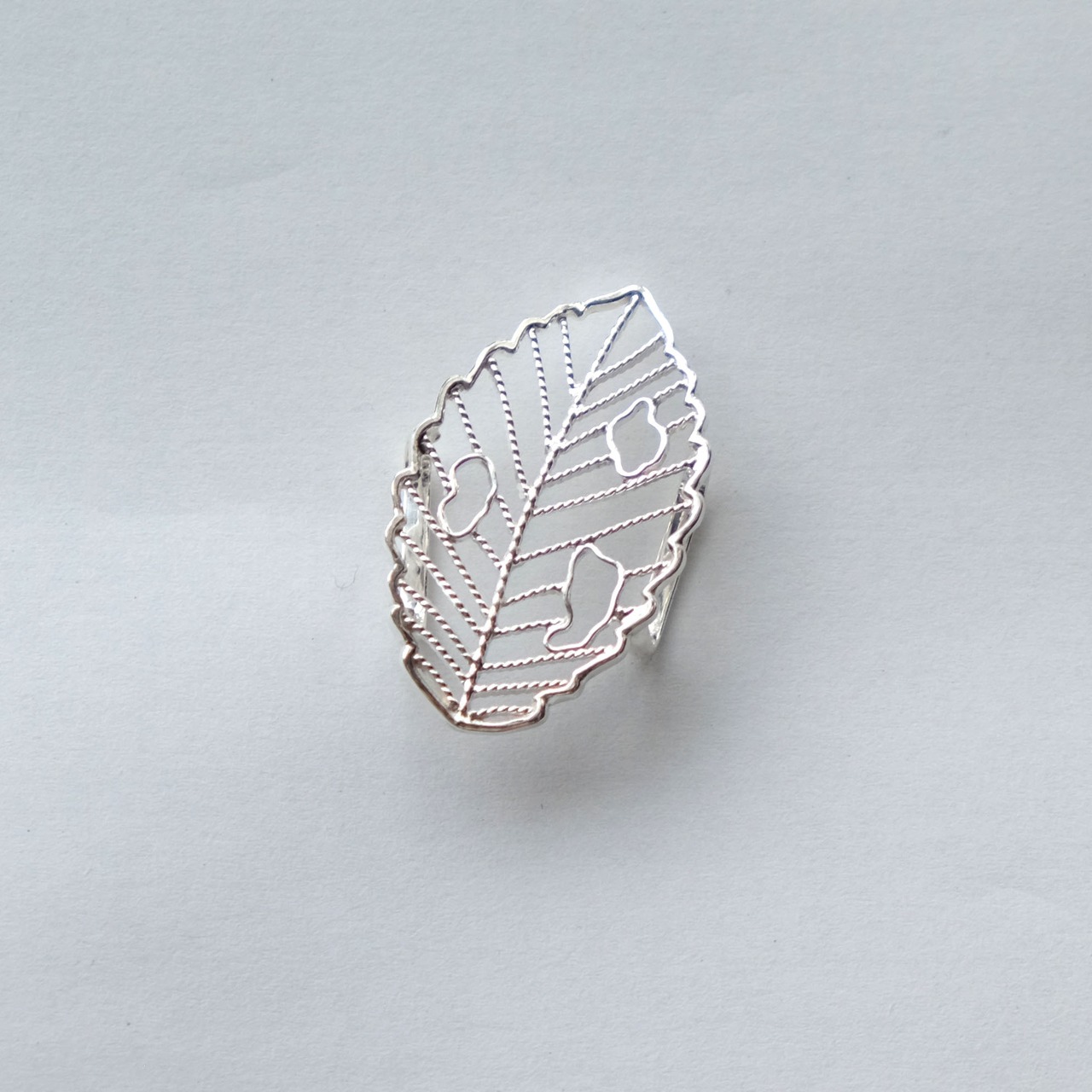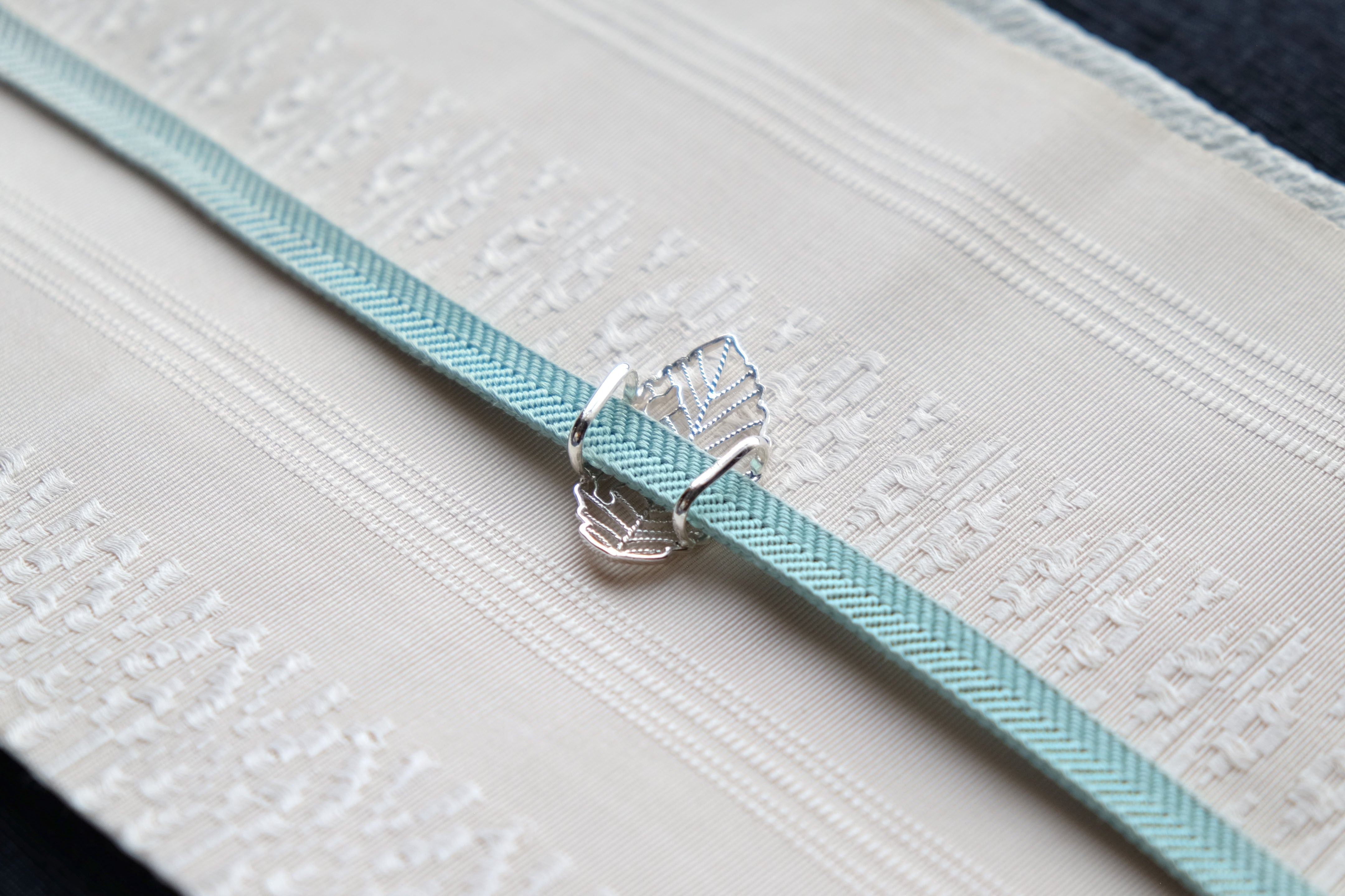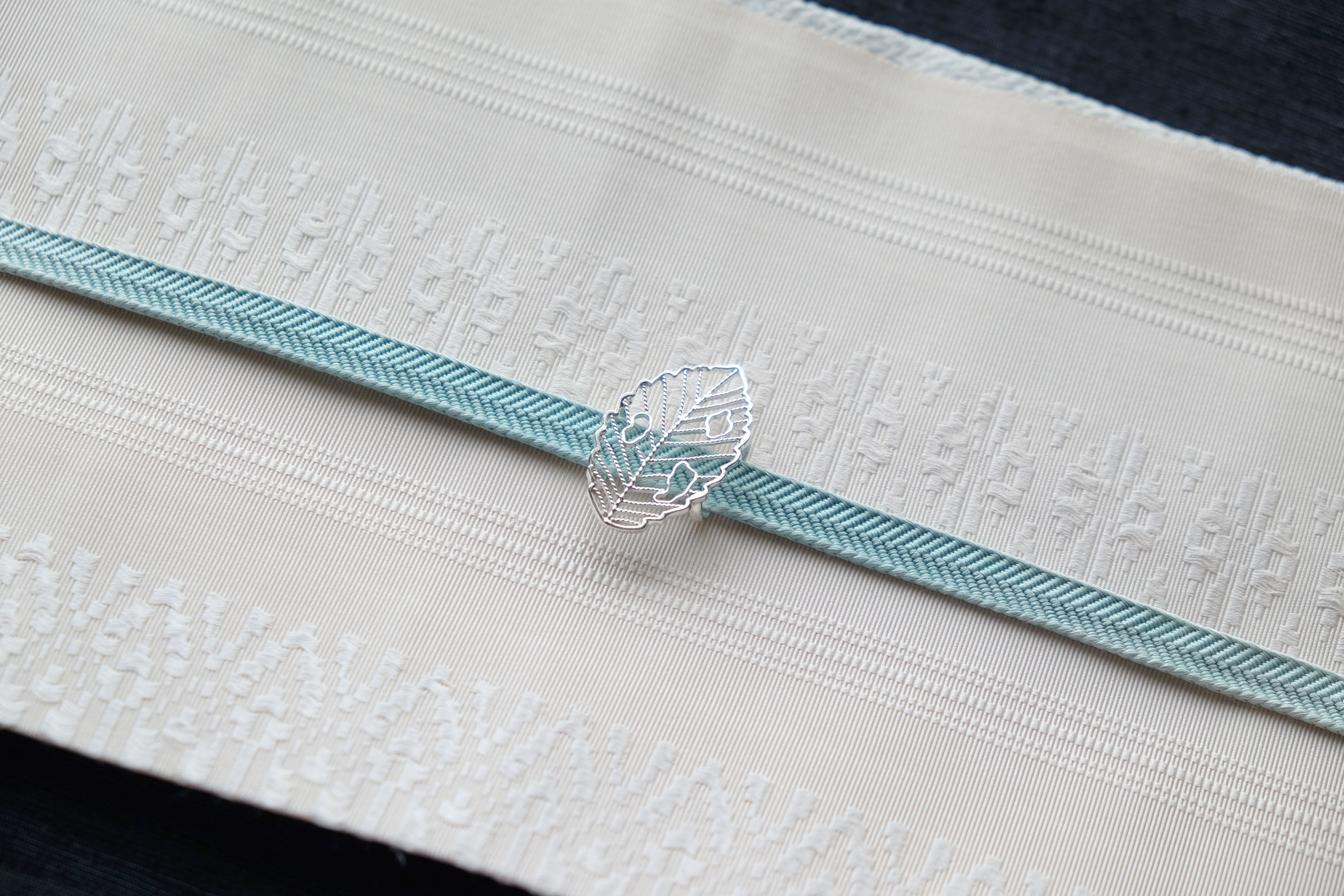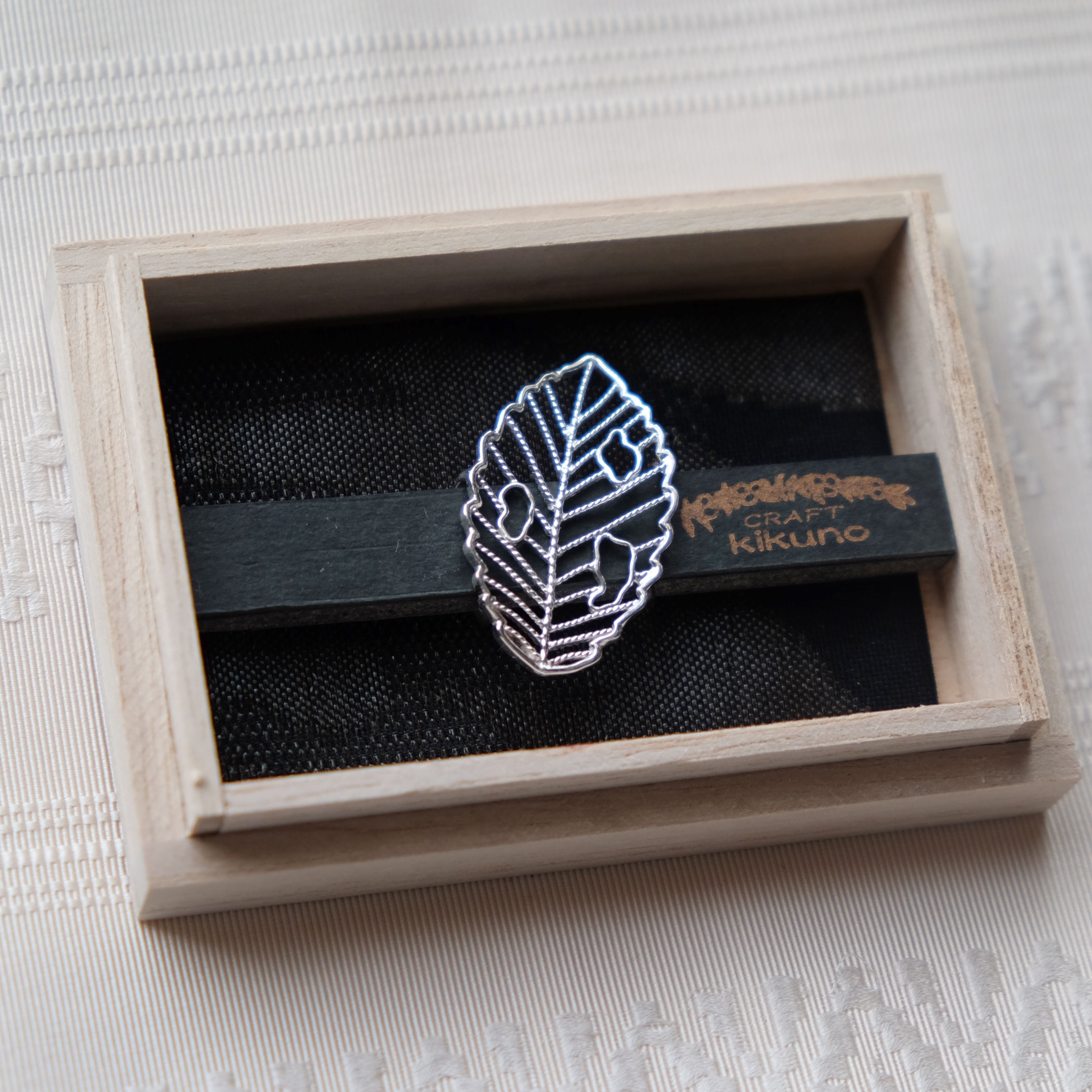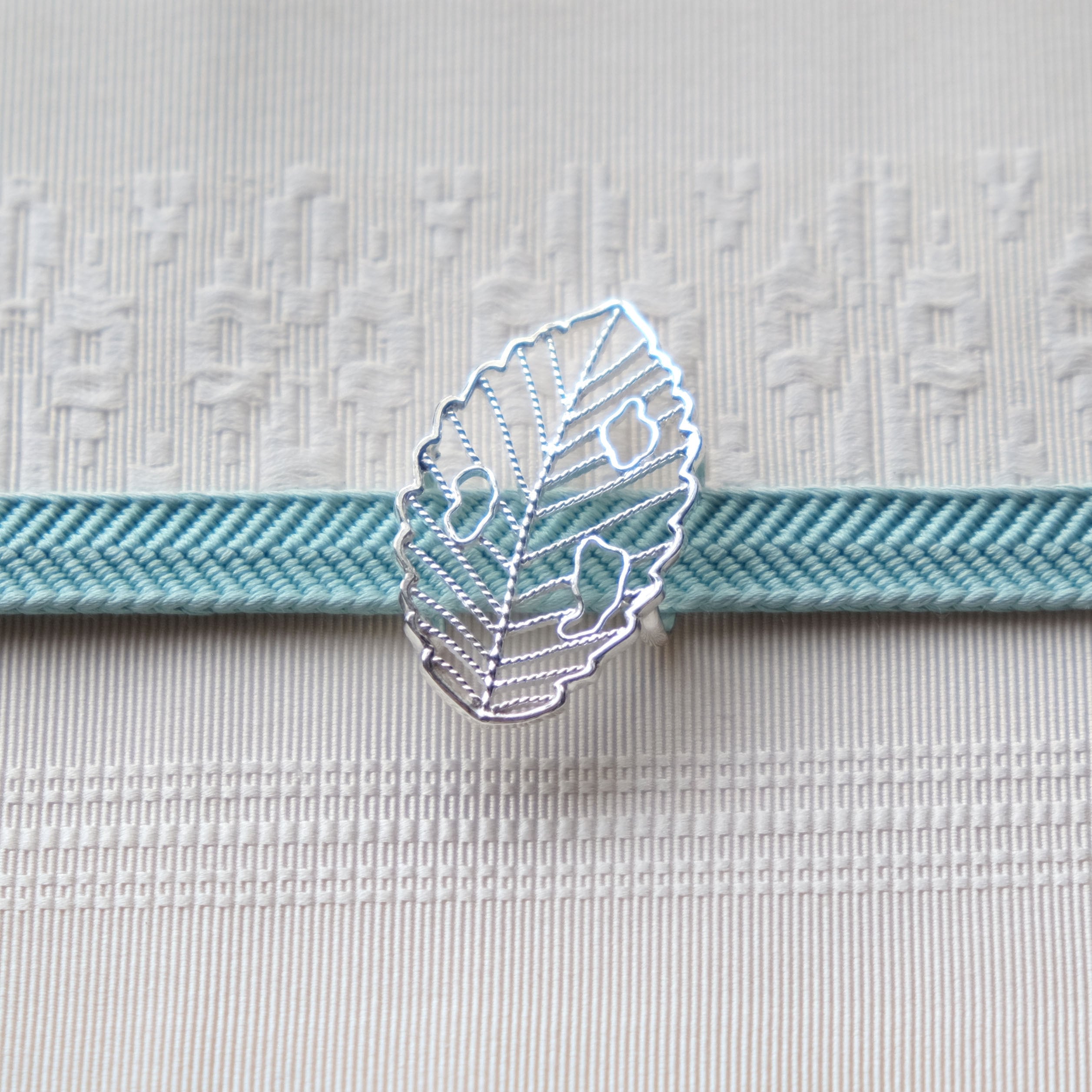 ケヤキの葉っぱを銀線で作り帯留にしました。